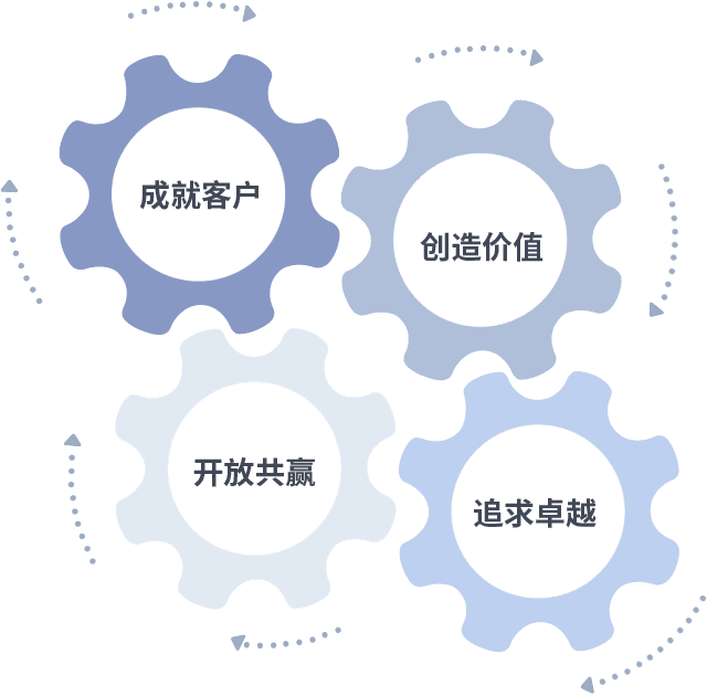 成就客户是一切决策的出发点,,,创造价值是衡量所有工作的标准,,,追求卓越是我们做事做人的态度,,开放共赢是我们的格局也是最终的结果。。。。价值观的齿轮环环相扣,,,推动着组织里的每个人不断向前。。。。