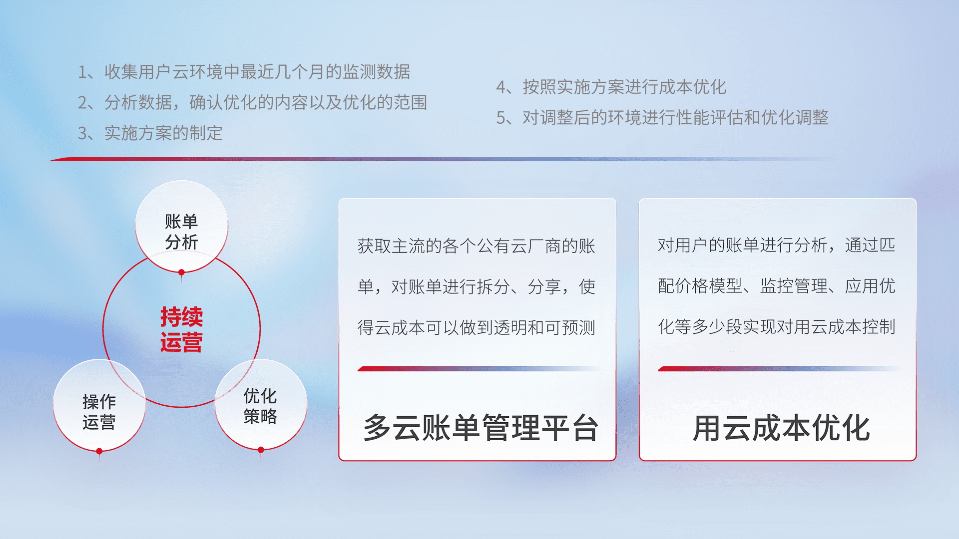 通过多云纳管,,以统一的资源数据模型把客户的云资源进行抽象和封装,,进而实现对多云资源的统一操作,,,,保障云资源管理的可靠性、、稳定性与可用性。。。。量身定制化运维内容,,,,配置、、、开发运维、、、补丁管理、、、备份、、监控、、认证和访问管理、、、、审计和日常巡检等,,,,保障在用云过程中的可靠度,,,,稳定度以及高可用率。。。。